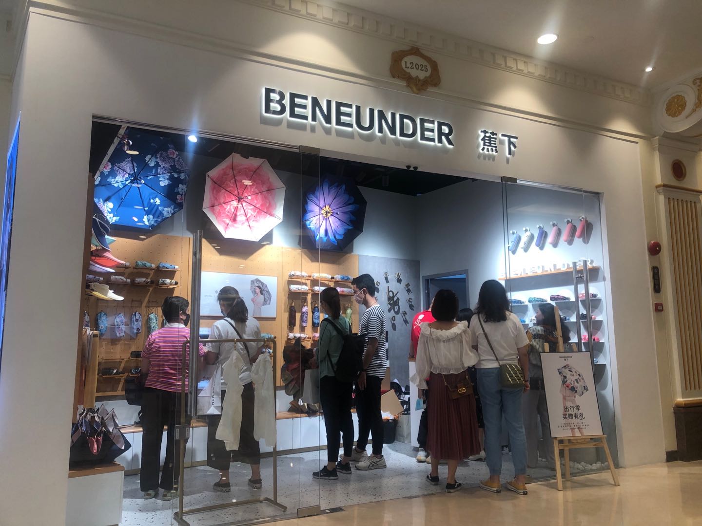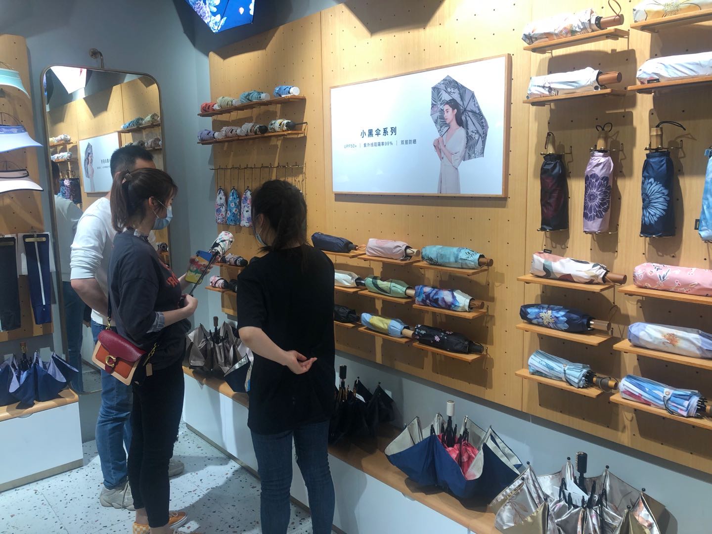 小店面积不到20个平方米,主打防紫外线的遮阳伞。4月中旬刚刚开张,初来乍到,但此前已是线上网红,天猫官方旗舰店的粉丝数为231万。不过,线上再火,终要“落地”开实体店。袁店长说,开实体店有利于展示品牌形象,增强顾客体验与互动,并从中汲取反馈和灵感。