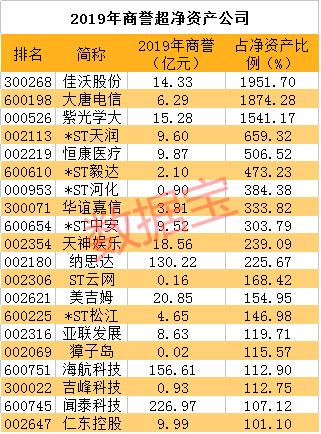 具体到不同上市公司,商誉占净资产比例越高,受到的影响则越大。在2019年A股“上市公司商誉榜”中,有20家公司商誉超过其净资产。具体看,佳沃股份去年底商誉超过14亿元,是其净资产的19倍多。另外,大唐电信和紫光学大两家公司去年底商誉是其净资产的10倍以上,*ST天润、恒康医疗、*ST毅达等公司去年底商誉是其净资产的4倍以上。