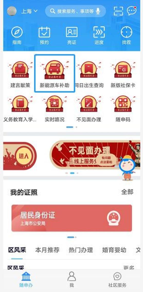 通过个人账号登录“随申办”APP。用户请先实名认证并且保持登录状态,进入“新能源车补助”。