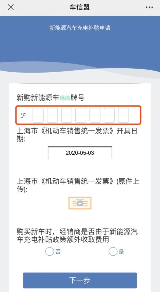 提交车牌号及发票信息。如下图,首先,需要点击红框内空白处完整填写新购新能源车绿牌牌号;其次,填写购车发票的开具日期;随后,点击下图黄色框,拍照上传购车发票;最后,根据购车实际情况勾选是否被经销商收取额外费用。填写完毕后,点击下一步。