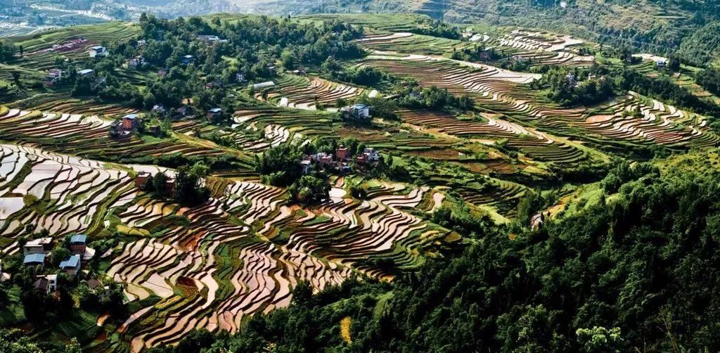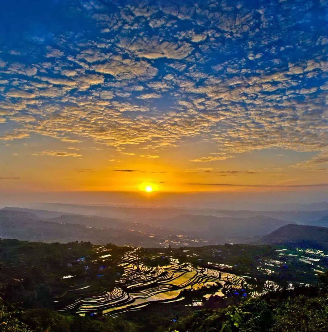 大石板梯田可用古老二字形容,它起于唐朝、成于明代,倚靠凤凰山坐南朝北顺势而下,共有1133层,最高处海拔1027米,最低处海拔却不到500米。