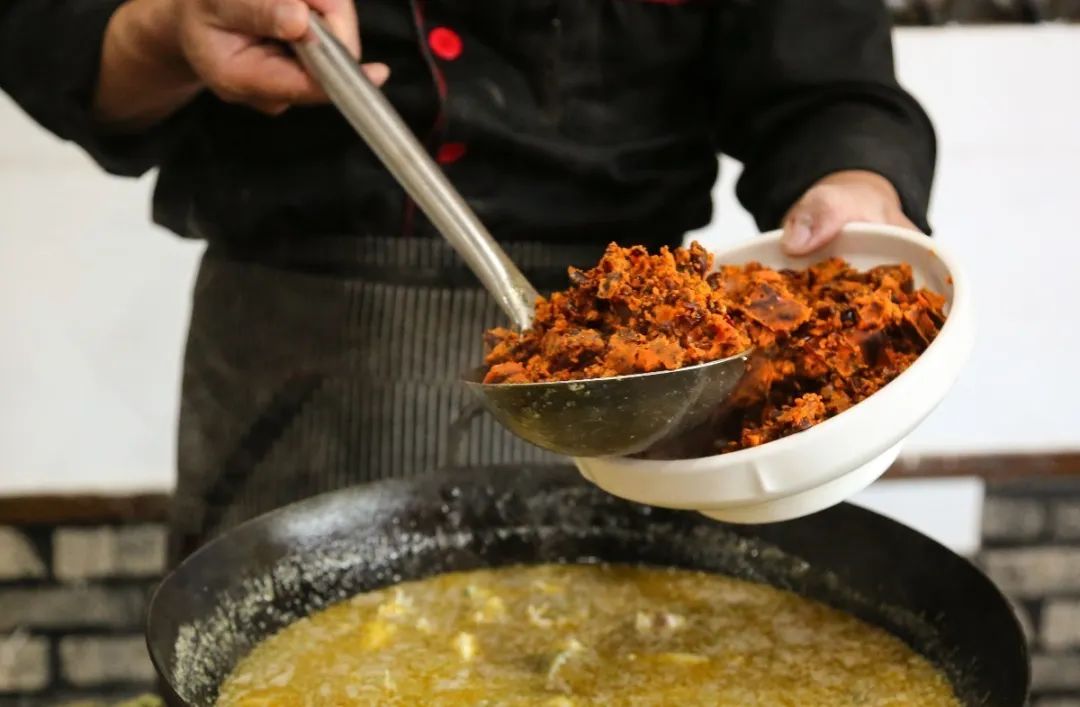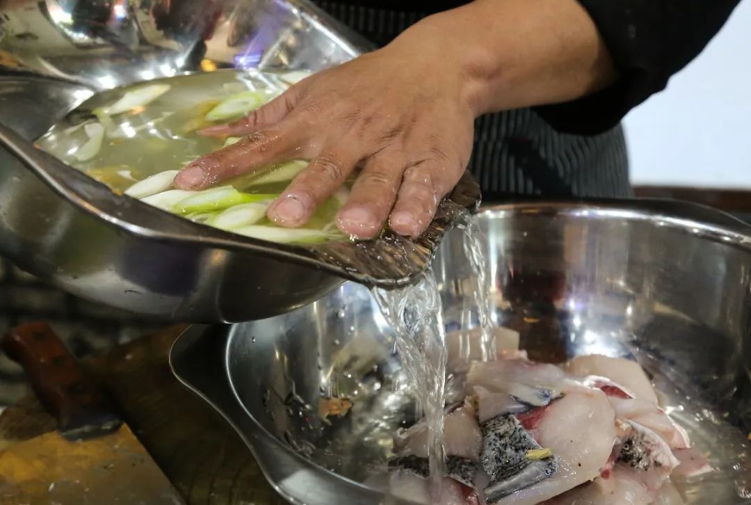 大骨汤做底,秘制酱调味,主角是花鲢鱼和美蛙,浇上红油、撒满辣椒,用油一泼,嗞啦……香气立刻飘满全屋!吃过鲜蛙、嫩鱼,添汤涮菜更加过瘾,一餐过后,鲜、香、滑、嫩,麻、辣、热、爽尽在舌尖芭蕾,让人欲罢不能。这就是明记老板姚志明的拿手绝菜——麻辣美蛙鱼。
