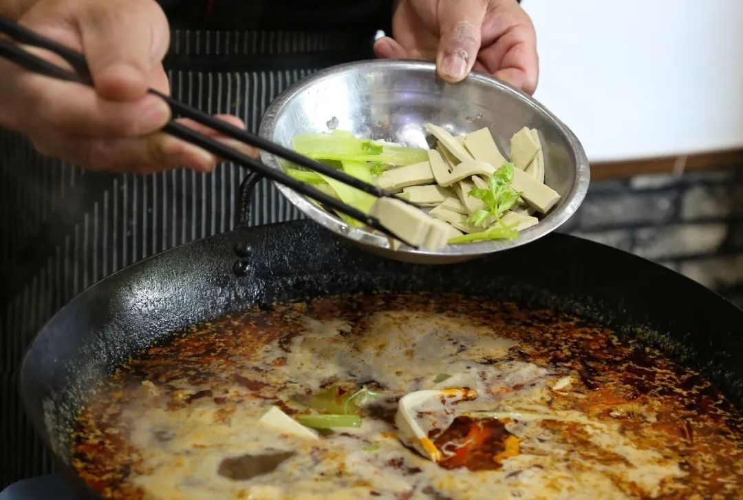 6、加入芹菜、莴苣、锅烧豆皮等配料,并加入盐、鸡精煮开。
