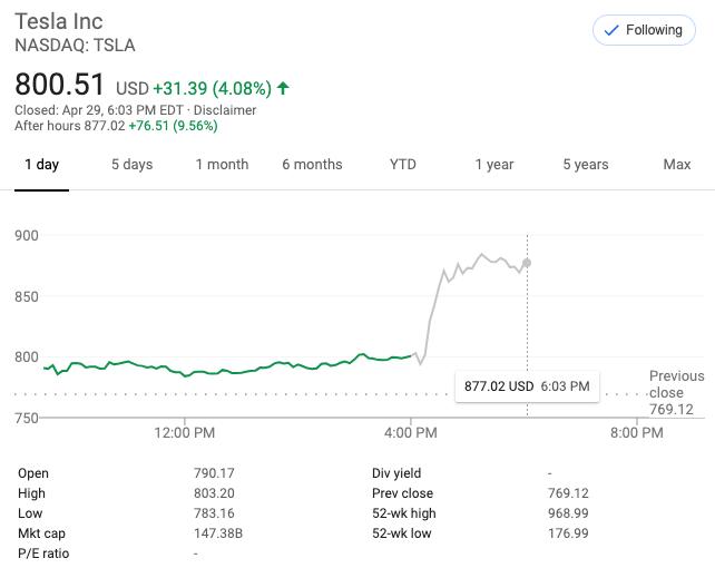 事情是这样的,前几天特斯拉发布了2020年Q1季度的财报(发布财报在美股收盘后),随后特斯拉盘后股价爆涨近10%。