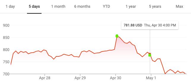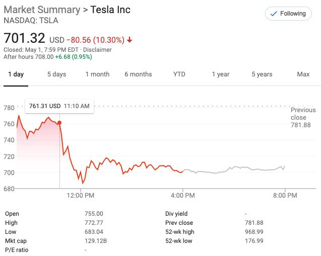 事件在一系列媒体发酵后,财报电话会议次日(4月30日,北美时间)特斯拉的股价直接暴跌近9%。