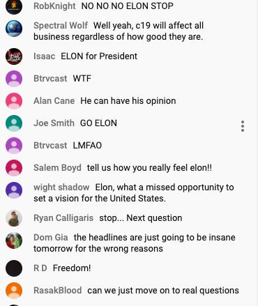 Yeah we are a bit worried about not being able to resume production in the Bay area and that should be identified as a serious risk, um we only have to two core factories right now, one in shanghai and one in the bay area. And Bay area produce the vast majority of our cars, all the S/X, and most of the 3 and all of the Y. So the extension of the shelf-in-place or frankly I would call it improved forcibly imprisoning people in their homes against all their constitutional lines, my opinion. And raising people’s freedoms in ways that are horrible and wrong.(笔者听记)