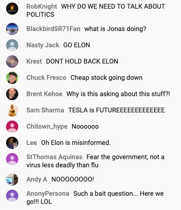 电话会议进行到Q&A阶段时,摩根·士丹利的研究员Adam Jonas问到关于特斯拉近期“变现能力(Liquidity)”时,马斯克提到了“复工复产”的问题,便随即提了一个敏感的“钓鱼问题”——你会对美国的法律制定人说什么。