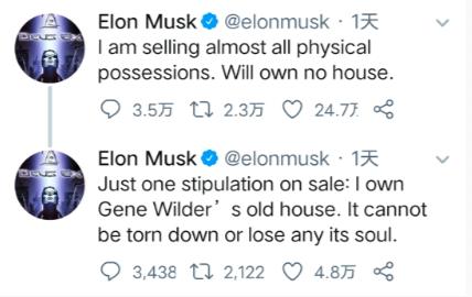 马斯克在5月1日(北美时间)接连发布多条推特,除了继续解释自己关于“强制待在家里”规定的看法之外,还有“我认为特斯拉的股价太高了”“我将会卖掉所有有形资产,包括自己的豪宅”“买我这套豪宅只有一个要求,这是Gene Wilder的故居,不允许被破坏拆掉或者丢失它原本的样子(灵魂)”。