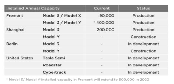 特斯拉弗里蒙特工厂年产能目前达到40万辆/年,将在2020年提升至50万辆/年;上海工厂目前能够达到4000辆/周,预估年底将实现6000辆/周;柏林工厂在建,美国新的超级工厂将会在一个月内宣布选址地点。