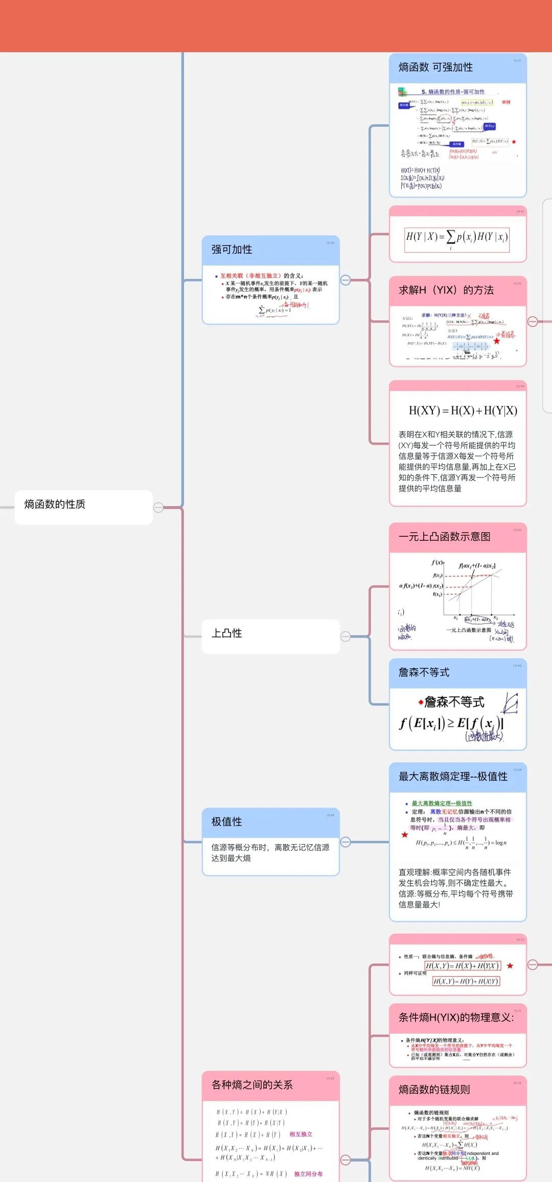 2017级数字媒体技术佘雨薇:偏概论的课堂,需要学习了解大量的背景和原理,如果写一堆东西死记硬背反而很难,这时用思维导图更好。但如果偏计算,除了简单的思维导图概念归纳以外,更适合用写具体知识点的方式归纳笔记,在写的同时也把例题的解题思路梳理了一遍。