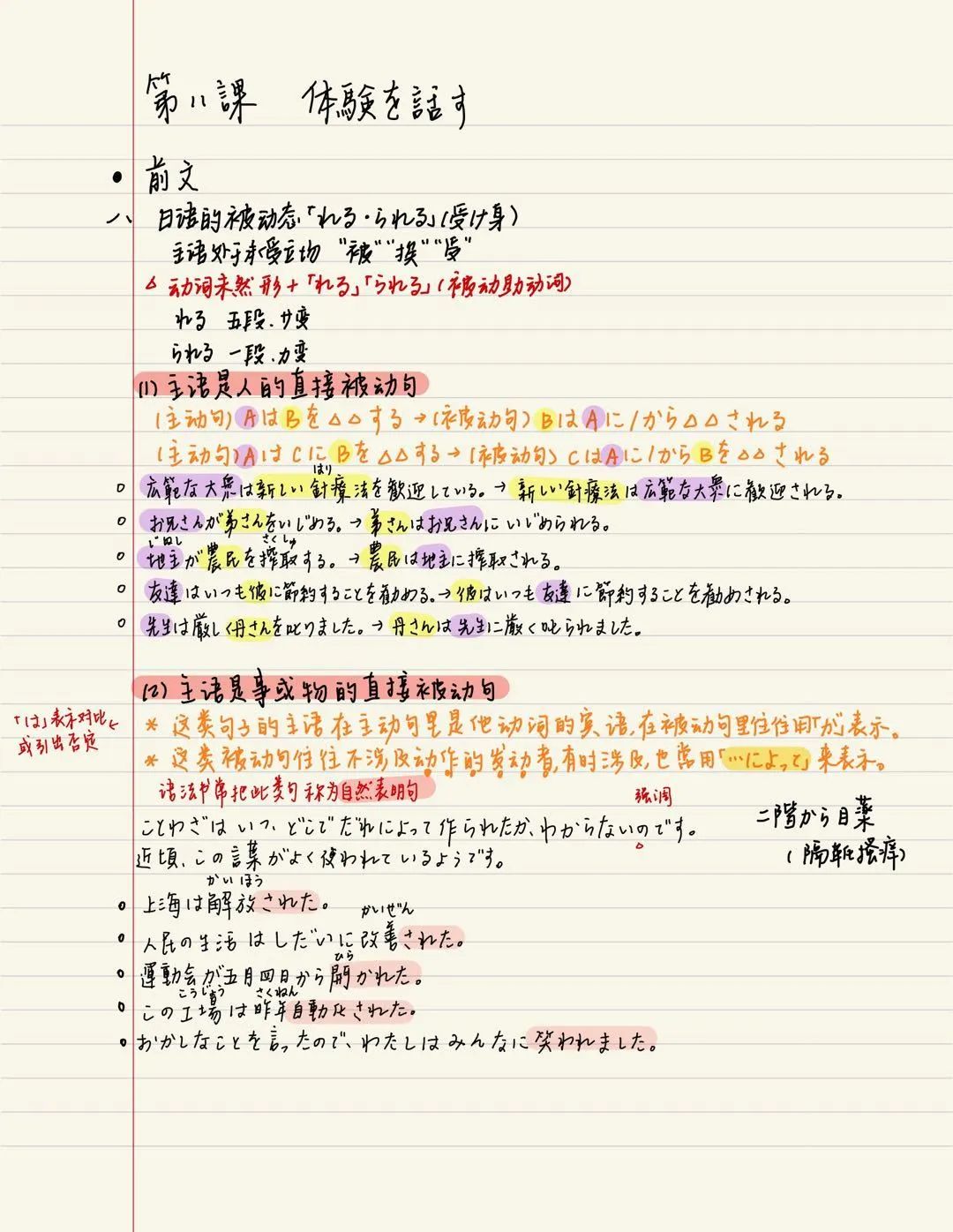 利用了“康奈尔笔记法”的格式,把一页纸分成了三部分:左边四分之一左右(线索栏)和下方五分之一左右的空间(总结)和右上最大的空间(草稿)。用不同颜色划分句子成分可以说是语言学习的“神助攻”,句子结构一目了然,丰富的颜色又可以加深印象、方便记忆。可以说是一位标准的语言学习者的笔记了。