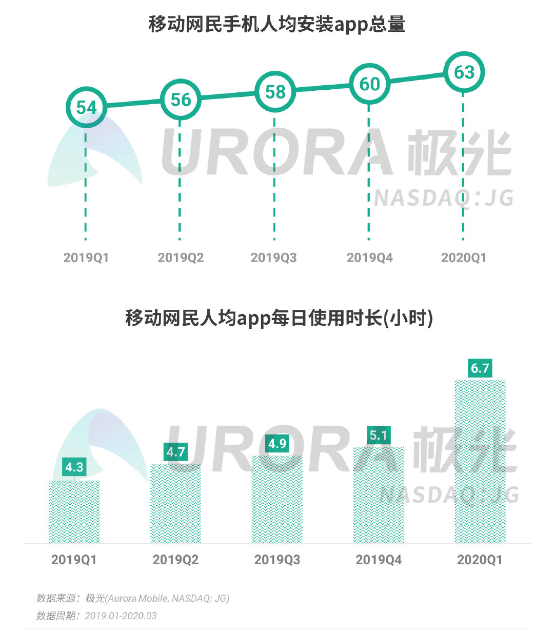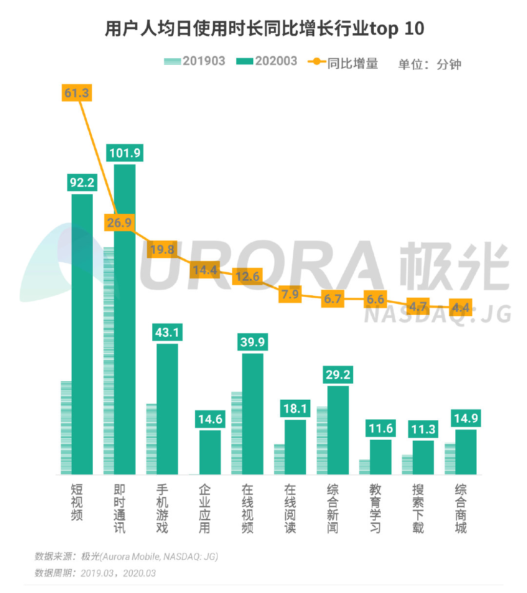 受疫情影响,全网用户上网时长大幅增长:2020年第一季度,人均单日app使用时长达6.7小时,相较去年同期增长2.4个小时