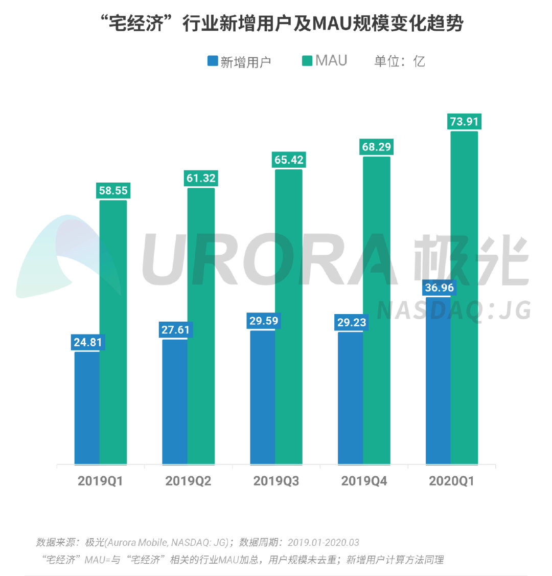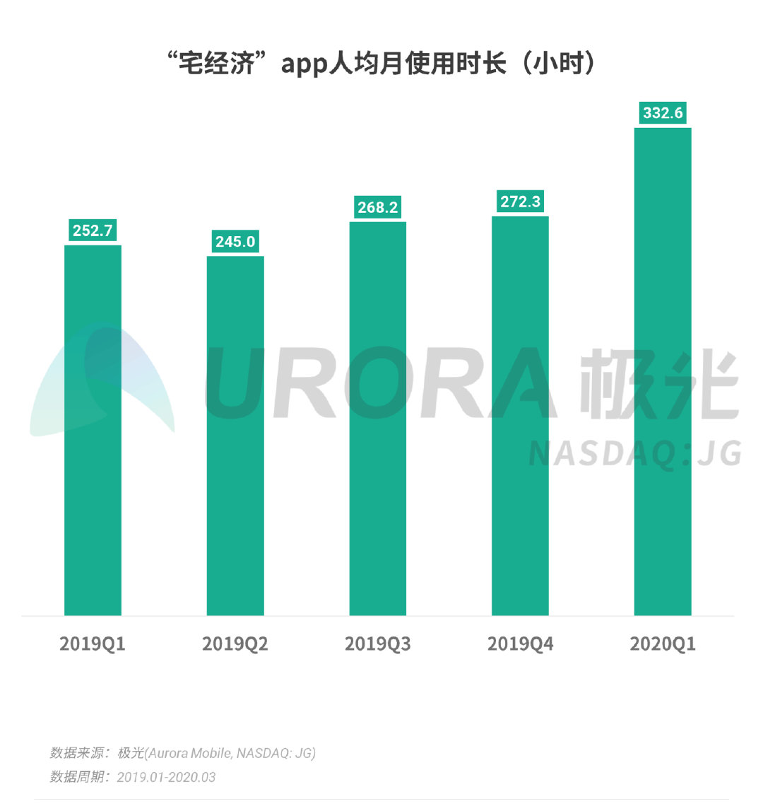 根据极光的统计,2020年Q1,“宅经济”行业中,活跃用户人均单月app使用时长增长至332.6个小时,环比增长22.1%,同比增长31.6%。从短期来看,疫情的发生对“宅经济”行业的发展产生巨大的刺激,同时也加速了一些新商业模式的发展,如远程办公、在线教育、生鲜到家行业等。从更长远来看,在“宅文化”日渐盛行的时代背景下,“宅经济”行业在用户规模以及用户黏性上仍有较大的增长潜力。