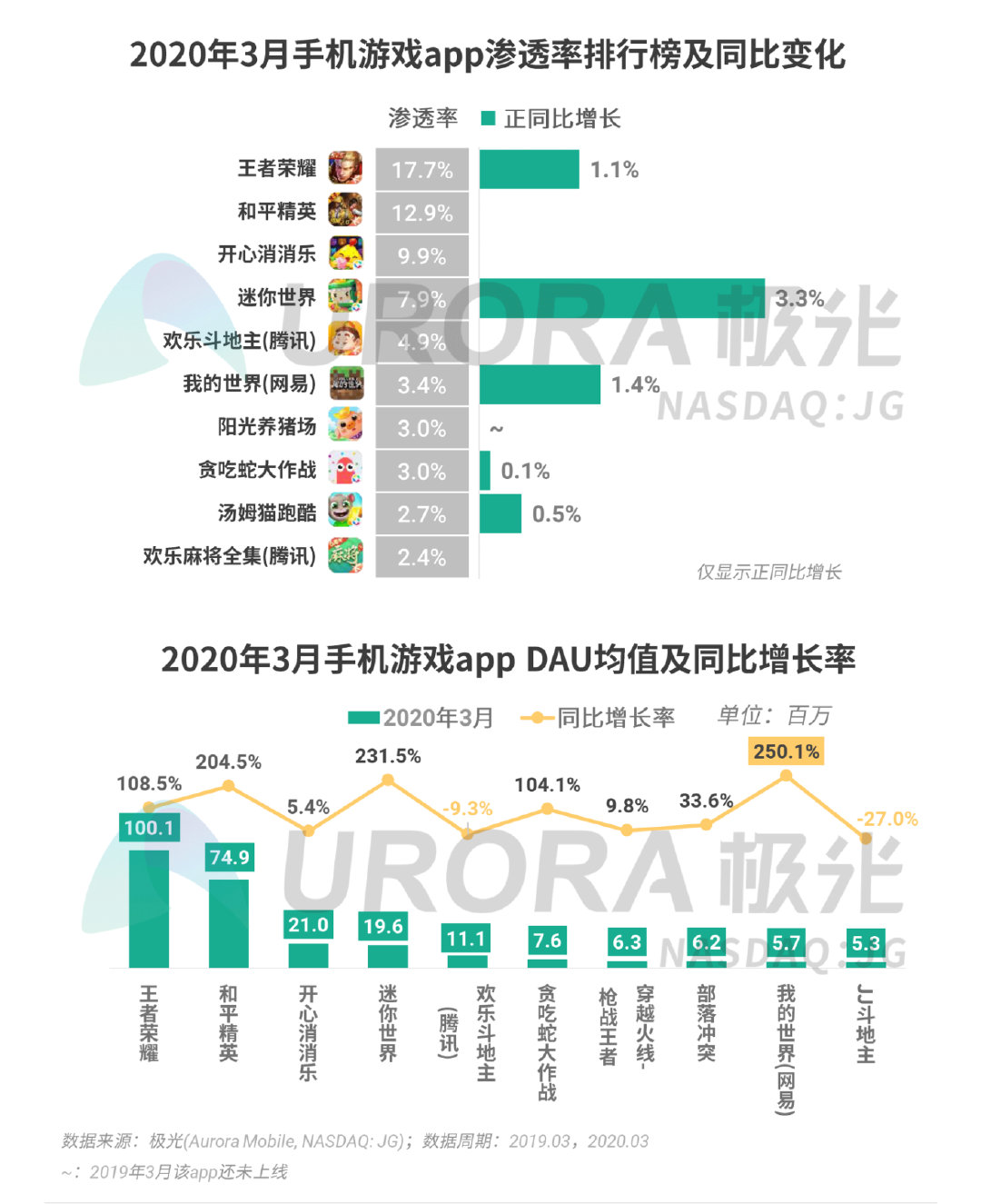 根据极光的统计,截止2020年3月,王者荣耀仍然是覆盖用户最多的手机游戏,而迷你世界、我的世界(网易)等模拟经营类的游戏渗透率增长相对明显。此外,手机游戏app top 10中,除了欢乐斗地主(腾讯)以及JJ斗地主两款棋牌类手游DAU同比有所下降,其他游戏的DAU均有不同幅度的增长。
