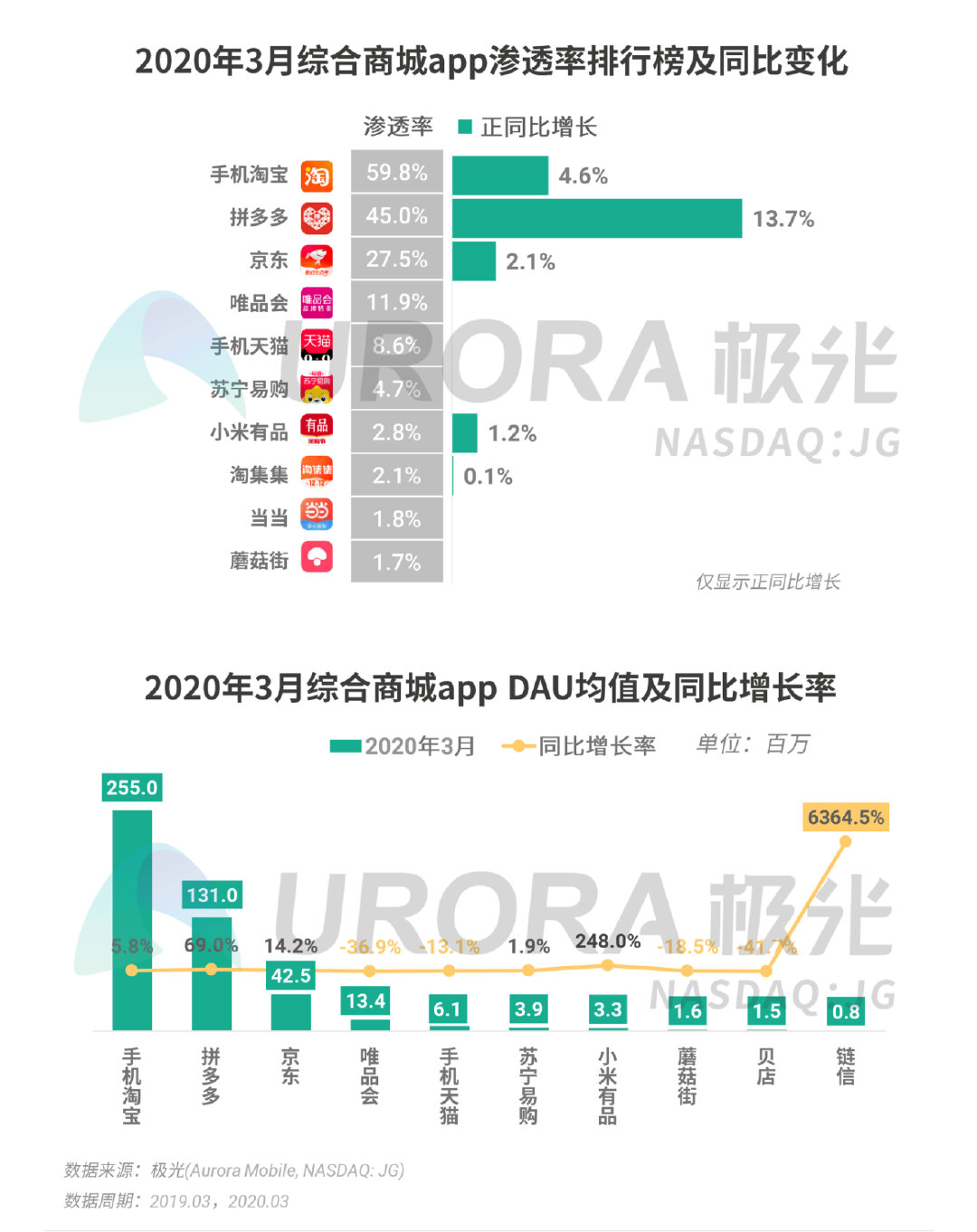 根据极光的统计,2020年3月,手机淘宝app以59.8%的渗透率以及2.55亿的DAU保持行业领先,而拼多多的渗透率同比增长则最为明显,达13.7%。此外,具有“网赚”功能的电商平台链信DAU同比增速最快。