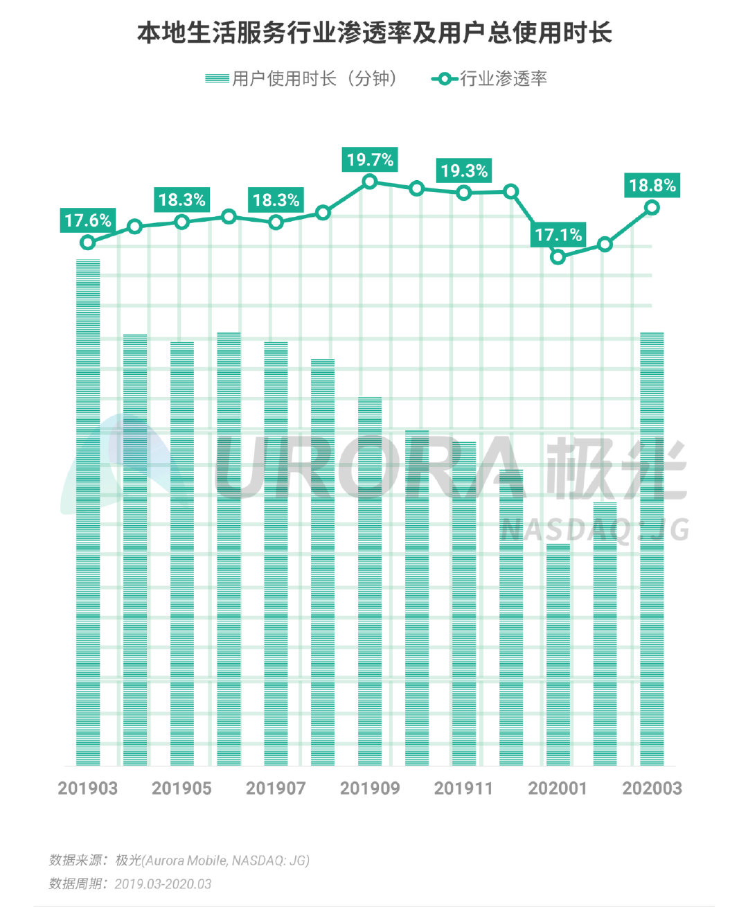 根据极光的统计,2020年Q1,受到春节假期以及疫情的双重影响,本地生活服务业渗透率在1月份经历了短暂的下滑之后,从紧接着的2月份开始逐步回升,截止3月,在全国基本全面复工复产的基础上,本地生活服务行业渗透率增长至18.8%,同时用户时长也出现大幅提升。