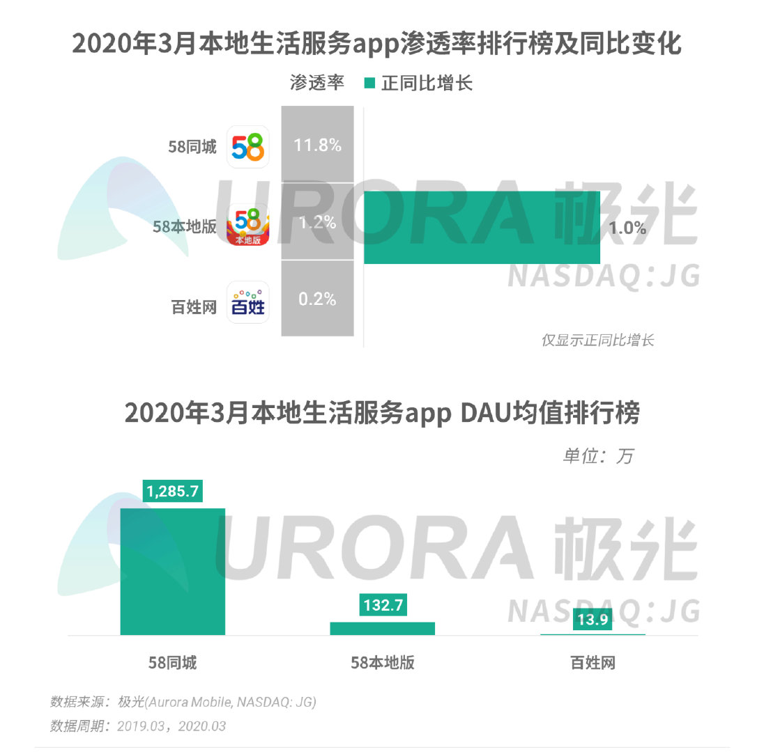 经过多年的发展,58同城已在本地生活服务行业中占据绝对的领先地位。2020年3月,58同城以及58本地版app仍然为本地生活服务行业的top 2,其中,于2017年上线的58本地版持续发力下沉市场,以较快的速度增长, DAU达132.7万。疫情期间,58同城利用了平台自身的优势先后在招聘、房产、本地生活服务等多个业务板块中推出多项举措,协助缓解疫情对中小微企业带来的冲击。同时,58本地版也为全国各地农户搭建起滞销农产品的产销对接平台,助力农户渡过疫情难关;2月份开始,58同城到家精选还针对家庭疫情防护的需求,正式推出“4小时消毒保洁”业务,为广大用户提供高性价比且有安全保障的专业上门消毒服务。