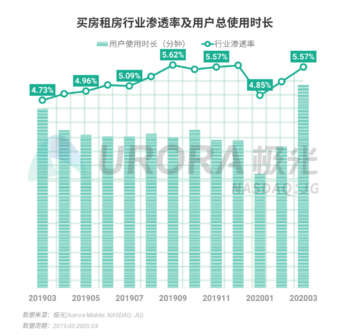 根据极光的统计,2020年1月,在春节和疫情的双重影响下,买房租房行业遇冷,渗透率和用户时长跌至谷底。2月份,随着全国陆续复工复产,加之多家头部平台针对疫情防控大力推动“云看房”功能,买房租房行业开始回暖。至2020年3月份,行业渗透率已上升至5.57%,用户使用时长也恢复至每年的高峰期水平,甚至较去年同期有所增长。疫情之下,全国已有多个城市对公积金政策作出不同程度的调整。同时,央行在4月公布将五年期LPR(贷款市场报价利率)由之前的4.75%下调至4.65%,这对于降低房贷成本来说具有积极影响。在“房住不炒”的原则下,近期全国楼市政策的松动对房地产尤其是新房市场构成利好,买房租房行业的发展形势预计会持续增长。