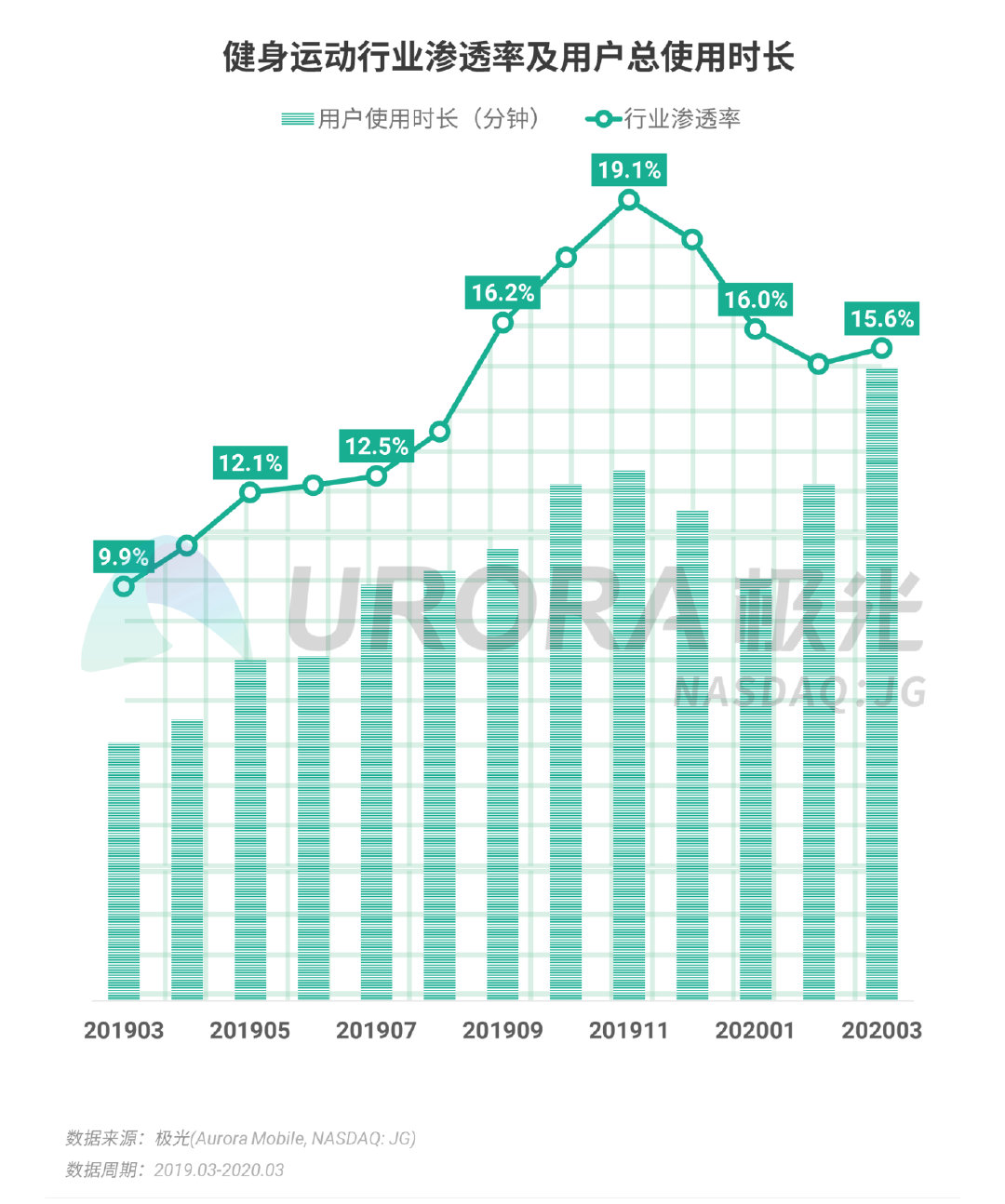 根据极光的统计,在过去一年,健身运动行业渗透率在2019年11月达到高峰后呈现持续下滑态势。2020年2月份开始,因为疫情而长期“宅家”的居民对于健身运动的需求开始增加,行业渗透率以及用户使用时长逐步回升。截止2020年3月,健身运动行业的渗透率为15.6%,用户使用时长则同比增长近1.5倍。