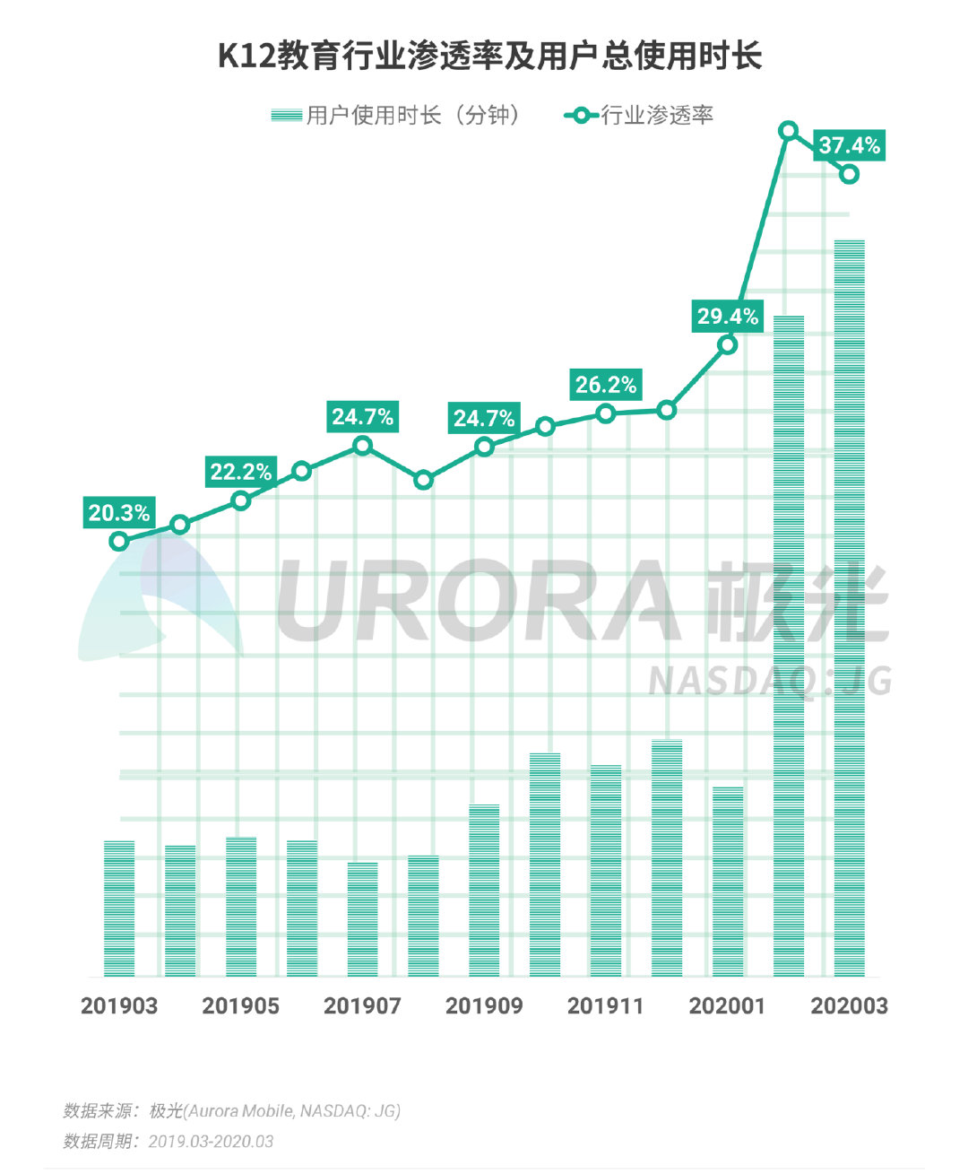停学不停课,K12教育行业用户规模及用户时长暴涨:2020年3月,K12教育行业渗透率达37.4%,较去年同期增长17.1个百分点,行业用户时长同比增长超4倍