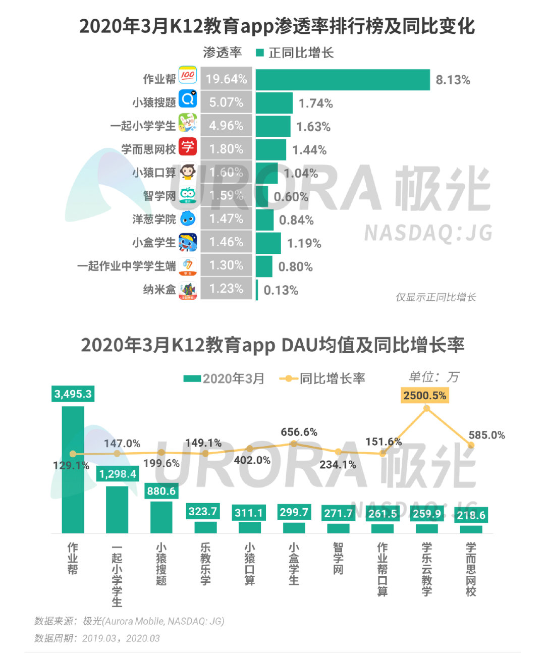 根据极光的统计结果,2020年3月,K12教育行业头部app的渗透率以及DAU相较去年同期均呈现出不同幅度的增长。其中,作业帮app以19.64%的渗透率以及3495.3万的DAU在行业中占据领先地位,同时渗透率同比增长8.13%。此外,在2020年3月底刚拿到10亿美元G轮融资的猿辅导旗下的小猿搜题、小猿口算两款app的渗透率均进入了行业top 10。