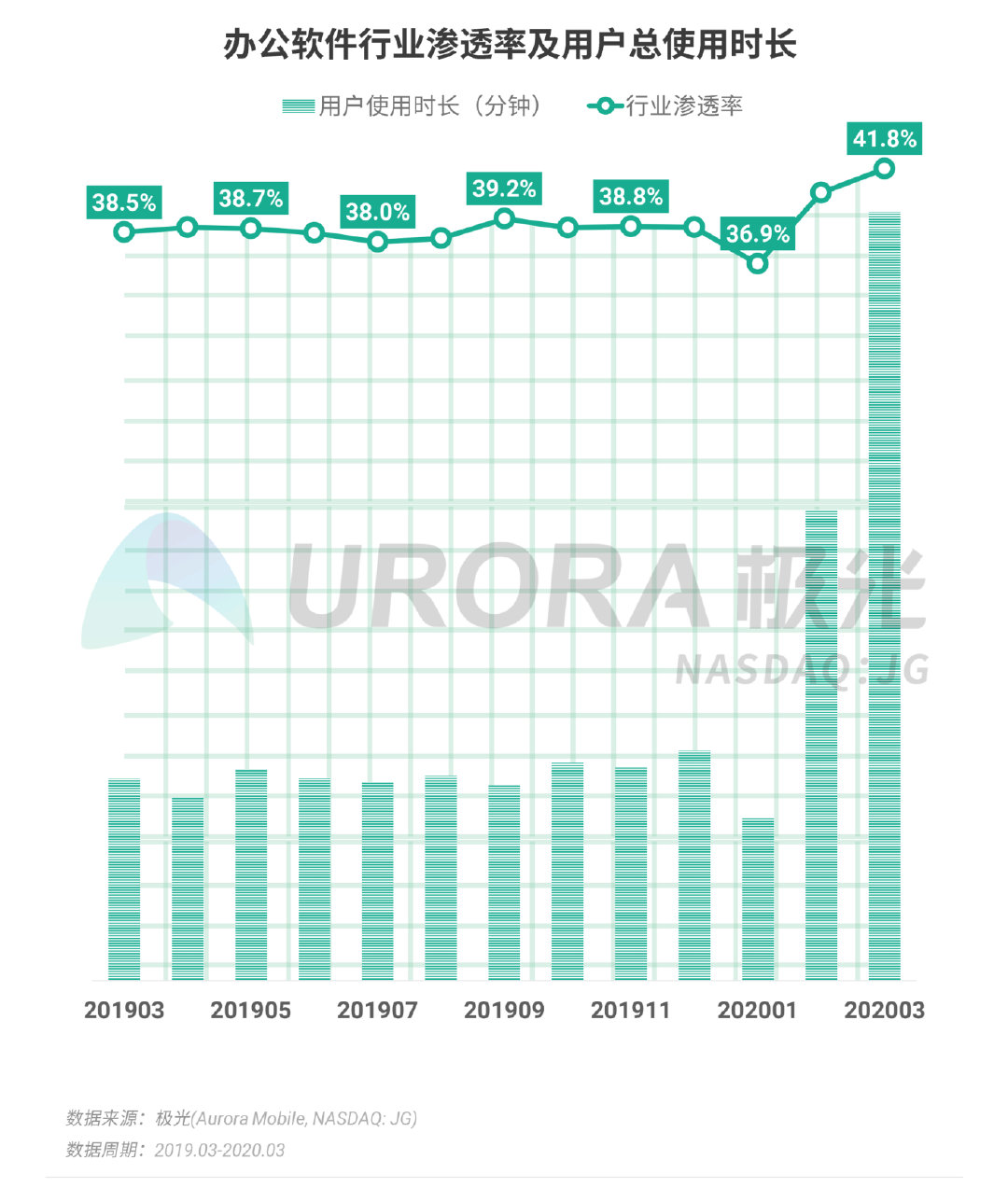 2020年Q1,在疫情的影响下,办公软件为各个企业实行远程办公提供了重要的技术和平台支持。根据极光的统计,办公软件整体的行业渗透率以及用户时长在经历了1月份的小幅下跌之后,在紧接着的2月份开始快速增长。截止2020年3月份,办公软件行业的渗透率达41.8%,同比增加3.3个百分点,用户时长则同比增长280.1%。