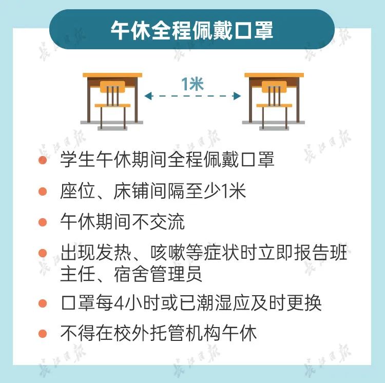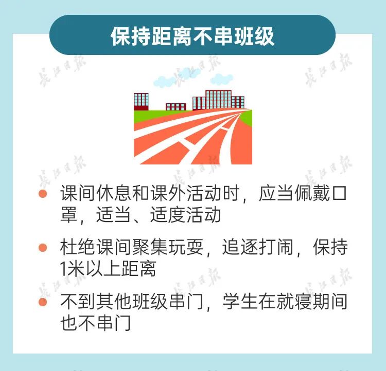 开学后,学校要实行错时上下学等形式,减少人员集中流动风险,校园内要划分班级活动区域、分批分区域户外活动,停止举办开学典礼等大型集会活动。上下学时,师生员工要提前备足、备齐工作和学习用品,佩戴口罩上班上学,并提前携带备用口罩,学校要安排人员有序引导,严格禁止接送孩子上下学的家长进入校园,避免校门口人群聚集。