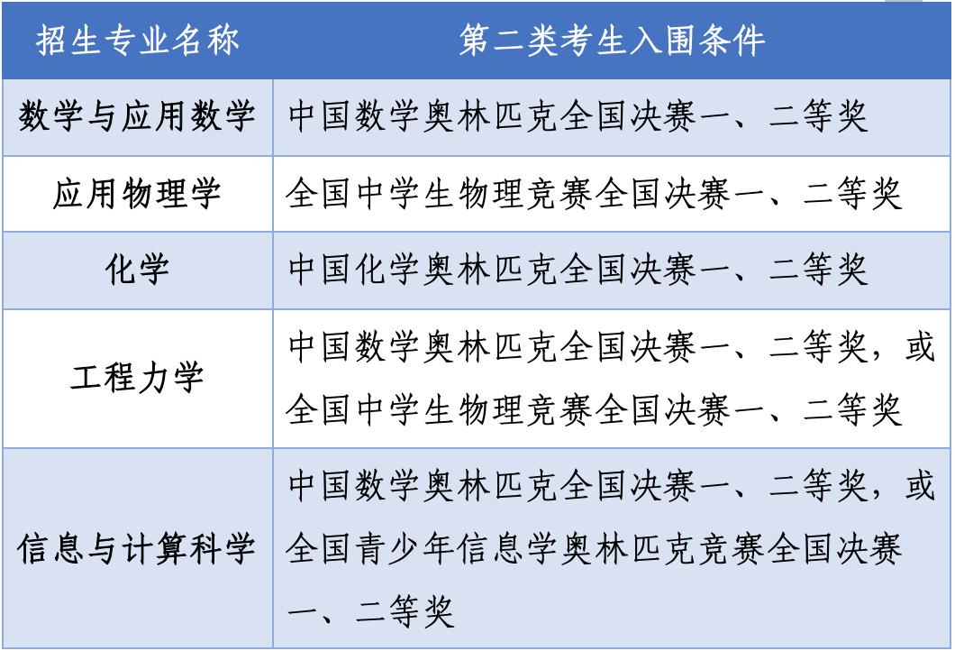 全国青少年学科奥林匹克竞赛(数学、物理、化学、信息学)全国决赛中获得一、二等奖的考生。全国青少年学科奥林匹克竞赛获奖学生以全国青少年科技竞赛获奖名单公示网站()公示的名单为准。
