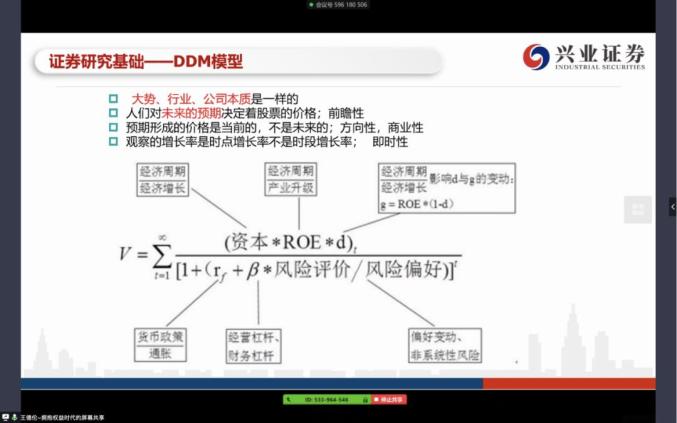 王德伦老师的讲授深入浅出,将策略研究的整体框架、研究的重点问题为我们进行了介绍,并穿插了详实的案例分析。听过课程,我对以下三点问题印象深刻。第一,研究要关注预期的边际变化,“预期差”才是影响股价变动的因素。第二,DDM公式是证券分析的基础,即股价由分子端的业绩因素、分母端的无风险利率、风险溢价决定,股价的波动是上述因子变动的结果。第三,经济周期的不同阶段,不同行业会有不同的表现,应该抓住规律性的行业轮动,同时结合具体的经济、政策环境来研判。收获远远不止上文所述,更多的还需要自己多研究、多消化。感谢王德伦老师的精彩分享,感谢庞家任老师和助教的辛勤付出。