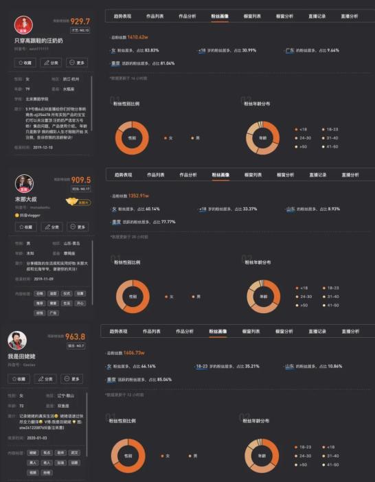 事实上,中老年人短视频内容的受众并非是大龄人。以“穿高跟鞋的汪奶奶”、“末那大叔”、“我是田姥姥”为例,根据新抖数据,这三位中老年头部网红粉丝基本聚集在18~35岁,以女性用户为主。尤其是,带货力最高的汪奶奶,女性粉丝占比高达80%。