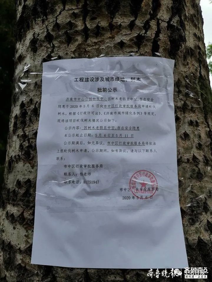 “平时来公园散步的市民挺多,得保证大家的安全。”工作人员表示,根据《行政许可法》和《济南市城市绿化条例》等规定,任何单位和个人不得擅自移植、砍伐树木,确需移植、砍伐的,要按规定办理审批手续,所以在确定砍树后,他们向市中区行政审批服务局提交了申请手续。