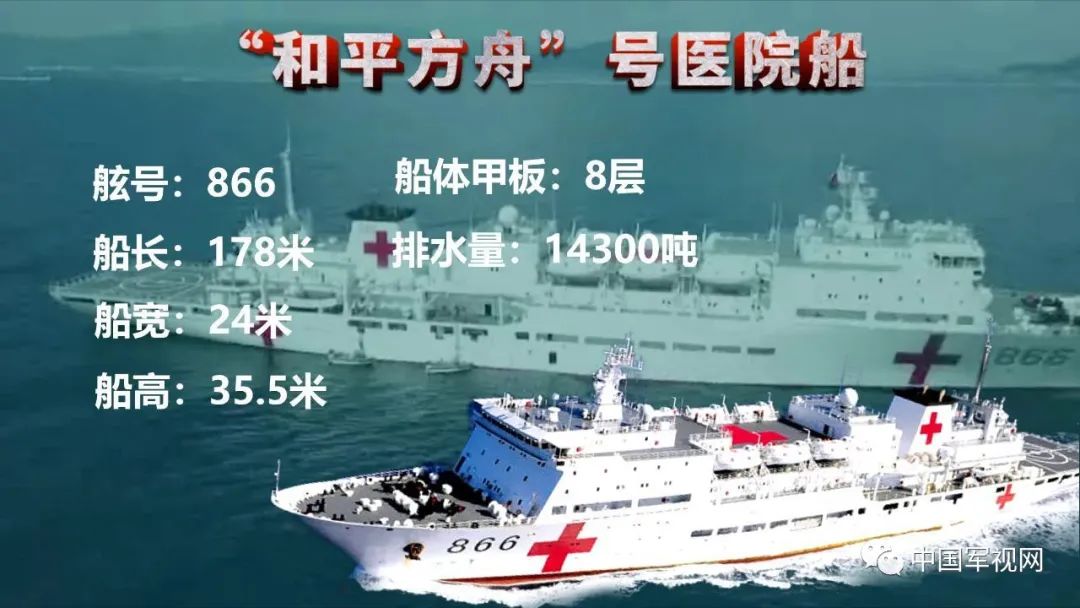 “和平方舟”号是我国自行设计建造的首艘制式远洋医院船,2008年12月入列,舷号866,船长178米、宽24米、高35.5米,共有8层甲板,排水量14300吨。船内设有伤病员换乘、检伤分类、门诊、住院、后送撤离五大医疗区,总面积4000平方米。医院船战时负责海上伤病员医疗救护,平时为我驻岛礁居民和部队官兵巡诊,执行国际人道主义医疗服务、重大灾难应急救援和对外军事医学交流与合作等任务。同样世界上除我国“和平方舟”号医院船外,还有美国海军吨位规模仅次于核动力航母的“仁慈”号医院船、英国皇家海军的“百眼巨人”号医院船和俄罗斯海军的“额尔齐斯”号医院船等。我国“和平方舟”号医院船自2008年12月入列以来,先后9次走出国门,航行24万余海里,服务43个国家和地区、23万余人次,2019年更被共青团中央、全国青联授予“中国青年五四奖章集体”,被海军表彰为“人民海军70周年突出贡献单位”,荣立一等功1次、二等功2次、三等功1次。以上种种荣誉,无不使得“和平方舟”号医院船