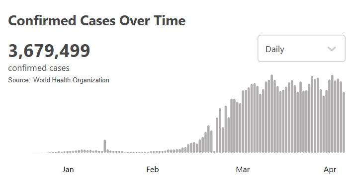 全球确诊新冠肺炎3679499例,累计死亡254199例。中国以外近360万例!