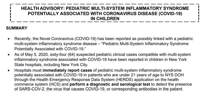 美国纽约州卫生部门6日发表声明称,纽约州已有64名儿童出现“小儿多系统炎症综合症”,尚不明病因,但怀疑与新冠肺炎有关。该病症状与中毒性休克综合征和川崎病相似,可能出现发烧、肠胃病症和皮疹,卫生部门要求所有医院如发现该病例立即上报。