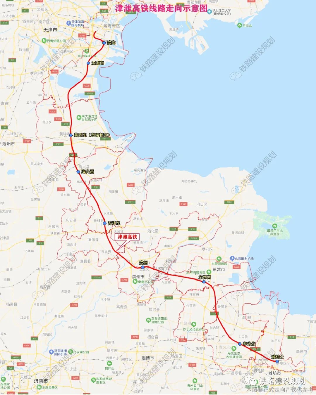 公示披露的最新线路方案如下:线路自天津枢纽滨海站引出,经天津市滨海新区大港、南港工业区、大港油田及北大港湿地自然保护区进入河北省,经沧州市黄骅市、海兴县上跨漳卫新河后进入山东省,经德州市庆云县(崔口镇),滨州市无棣县、阳信县、滨城区,东营市利津县、东营区、广饶县,潍坊市寿光市、寒亭区引入济青高铁潍坊北站。