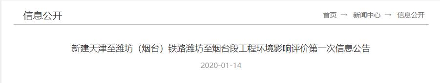 今年1月14日,《新建天津至潍坊(烟台)铁路潍坊至烟台段工程环境影响评价第一次信息公告》在山东铁投网站正式发布。