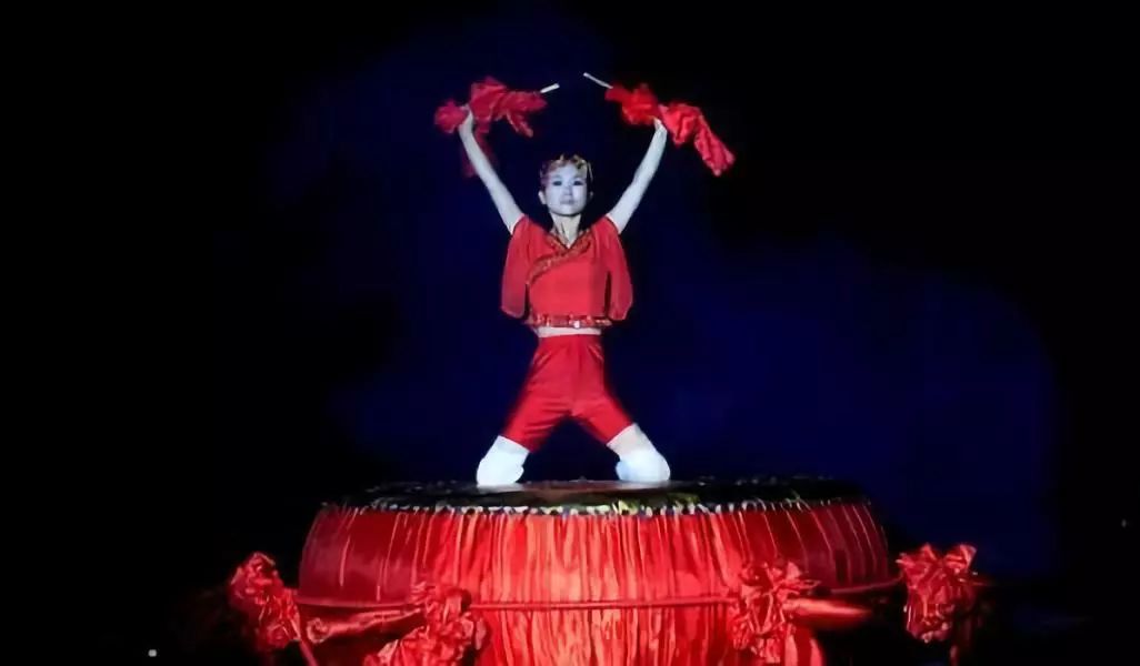 红色的大鼓,红色的衣裙,廖智跪在鼓面上起舞。
