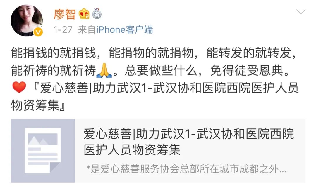 在疫情期间,她也时常发布关切的消息。经历过死亡的人,更懂生命的脆弱和珍贵。