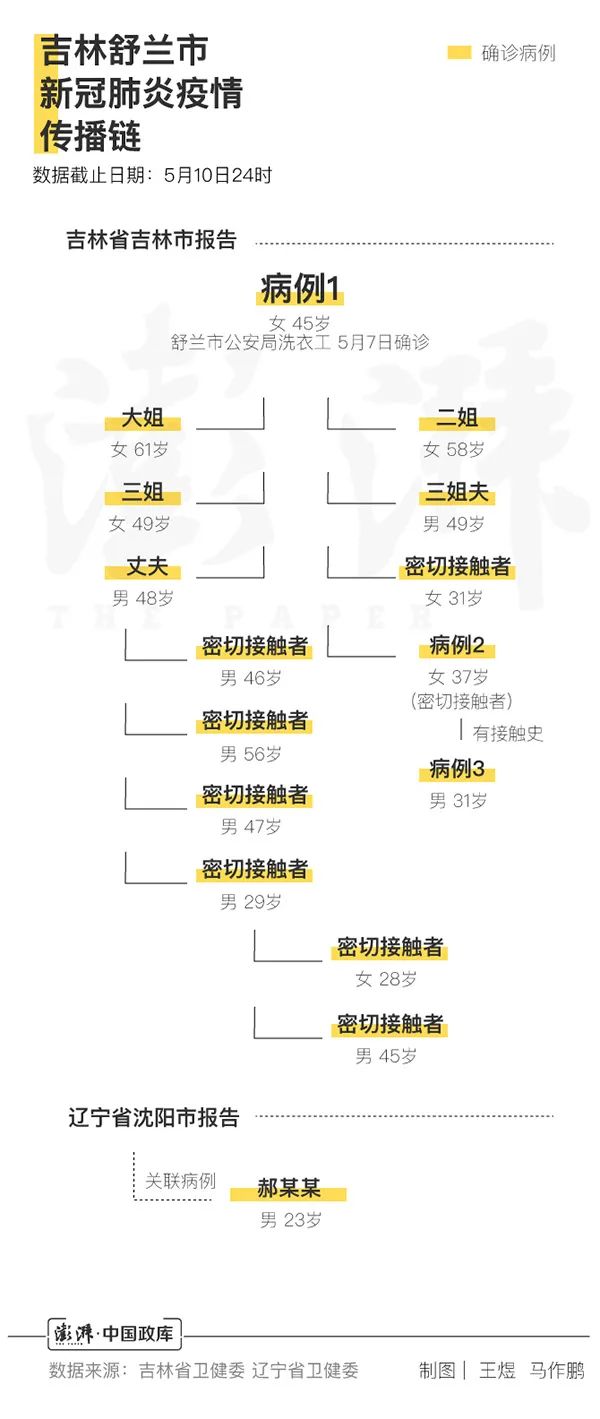 5月9日,吉林全省新增本地确诊病例11例,均位于吉林市舒兰市。11人中有5月7日确诊的45岁舒兰市公安局女洗衣工的丈夫、大姐、二姐、三姐及三姐夫等5人,还有她的密切接触者2人,及与确诊密接者有接触史者1人,其丈夫的密切接触者3人。