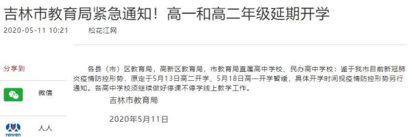 早前,舒兰市要求已经复学的高三、初三年级学生恢复网上授课模式,停课不停学。吉林省公主岭市教育局也于5月10日发布公告称:“为确保广大师生健康安全,原定于5月11日全市高中高一、高二年级(中等职业学校一、二年级)开学取消,具体开学时间另行通知。”
