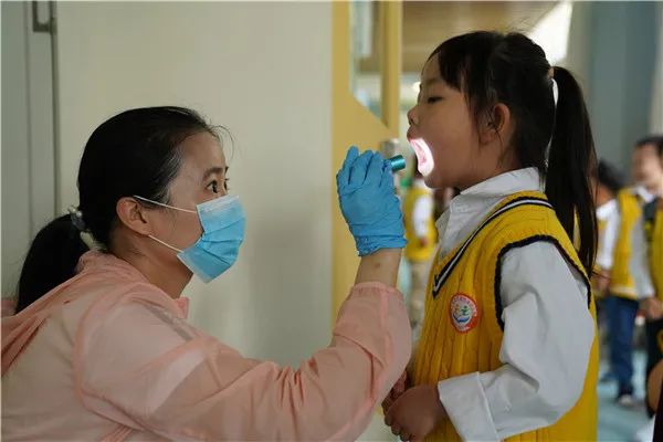 “宝贝,老师也很想你,来,我们先把鞋子换掉,一起进入班级吧!”在张文娣的帮助下,李睿泽在换鞋处更换鞋子之后,在保育老师的引导下进入班级进行二次晨检。贝贝班的主班老师拿着小手电筒检查了李睿泽的口腔是否有发炎、红肿等异常情况,又用额温枪对他进行了再一次的体温检测,并对他当天的体温进行登记,进入班级之后再用七步洗手法进行手部清洗,这时李睿泽才算是真正通过检查正式进入班级,开始了一天的幼儿园生活。