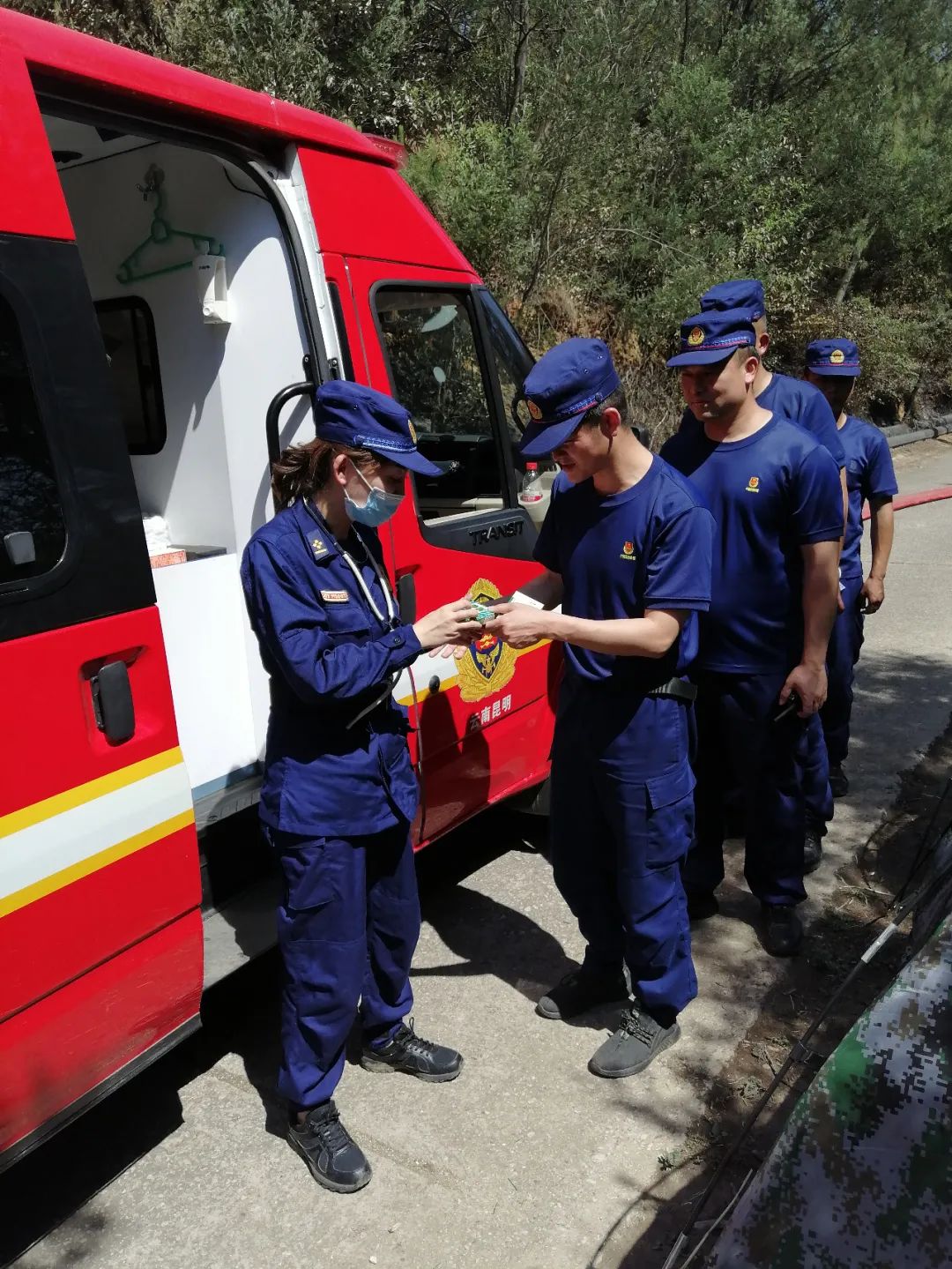 驱车1小时30分后,总队和昆明支队、训练与战勤保障支队第一批后勤保障力量到达现场,并火速成立现场医疗卫勤组,对指挥部营区及车辆进行全面消杀,最大限度做好防护工作。同时准备了口罩、20余类常见多发病药品600余盒,棉麻手套、免洗手消毒液等医疗物资,随时做好医疗卫勤保障。经过全面消杀后,饮食保障小组开始商定菜谱、准备餐食,确保所有指战员能第一时间吃上热饭。为给一线救援力量提供充足的食宿、供电、油料、医疗卫生等物资供给保障,总队调集了昆明支队15车38人,训练与战勤保障支队4车7人,出动油罐车、宿营车、餐饮车、发电车、装备抢修车、物资运输车、救护车、运兵车、远程供水系统、指挥车等车辆,携带食品、矿泉水、防疫物资、汽油柴油、被装、器材装备等保障物资到达现场,同时紧急联系了3家联勤企业到场参与保障(2家食品配送公司、1家照明设备企业)。其间,现场医务人员对20个执勤点近200名指战员开展巡查巡诊,主要针对中暑、咳嗽、咽干、感冒等主要病症开展诊疗,还不定时检测体温、喷雾洗消等,进一步强化了指战员卫生防疫能力。5月11日,楚雄支队战保分队2车5人,携带食品、饮用水、水果、牛奶、防疫物资和指挥部物资到达禄丰张家营火点,继续做好食品和物资保障工作,同时做好个别火点力量轮换的准备。精准细致,做你最温暖的依靠保障组每日安排专人对各类战勤保障车辆运行情况,后厨食材、灶具、油料、水泵,卫生防疫等进行检查,做到安全、放心。
