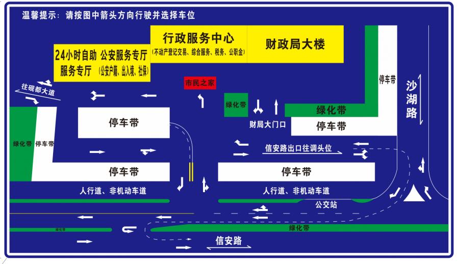 信安大道旁(行政服务中心西侧)增设有3分钟即走停车区,方便临时上下客。