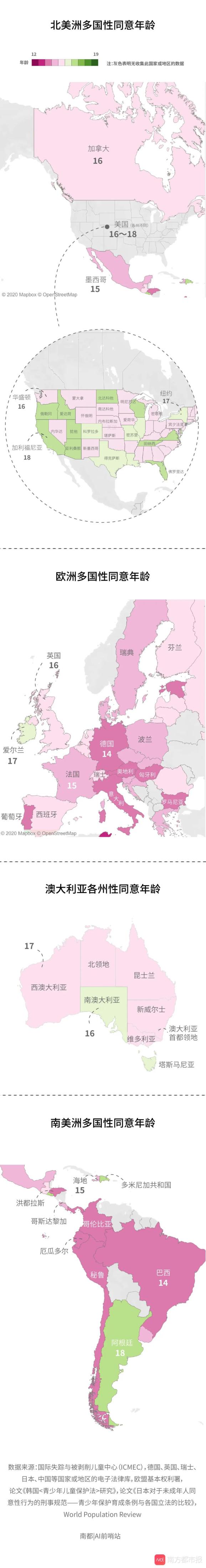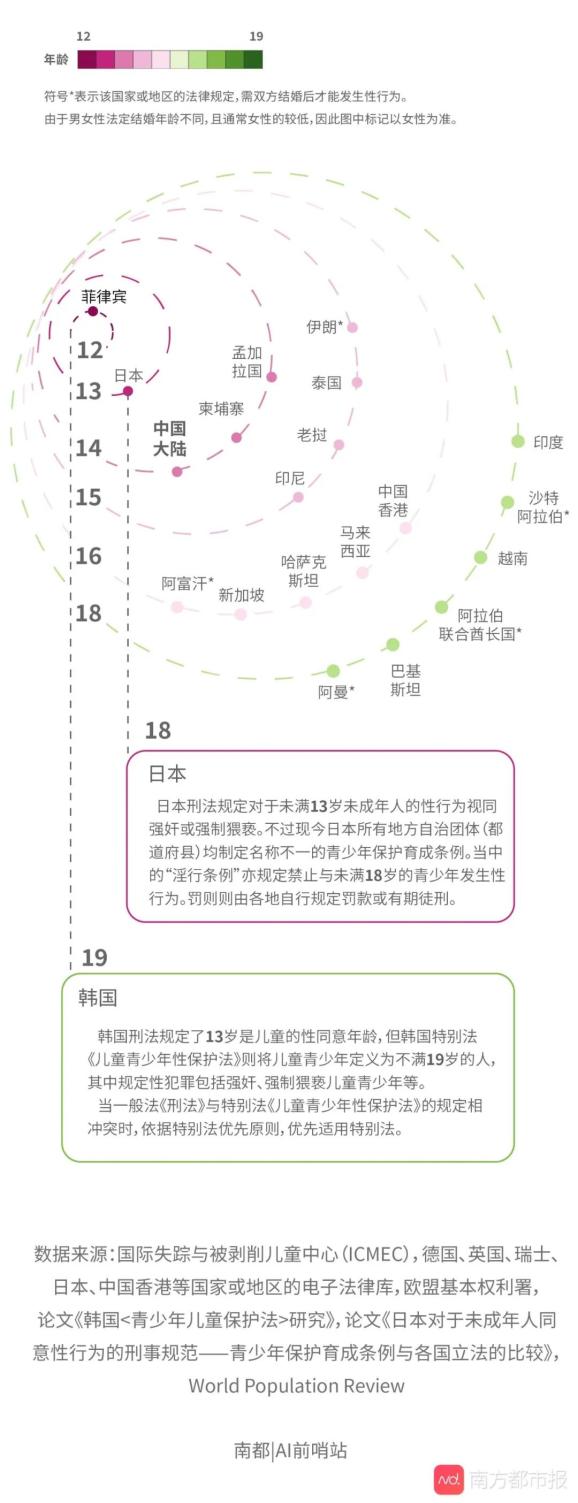 性同意年龄设定引发不少争议。记者整理公开资料发现,多国将性同意年龄设定为14至16岁之间。