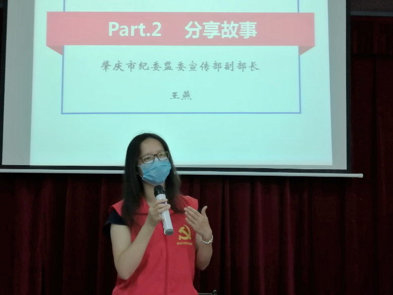 然后,来自挂点新元社区的肇庆市纪委监委党员志愿者王燕,与大家分享了自己在社区参与防疫工作的邻里和谐故事,她围绕“邻里互助 和谐共处”为主题,分别向参与活动的人员阐述了发生在自己身边的邻里互助的实例,用真实事例解读社会主义新时期精神文明建设给大家的生活带来的便利,同时还向社区居民诠释了邻里相处之道,宣传引导大家树立正确的人生观、价值观、道德观。