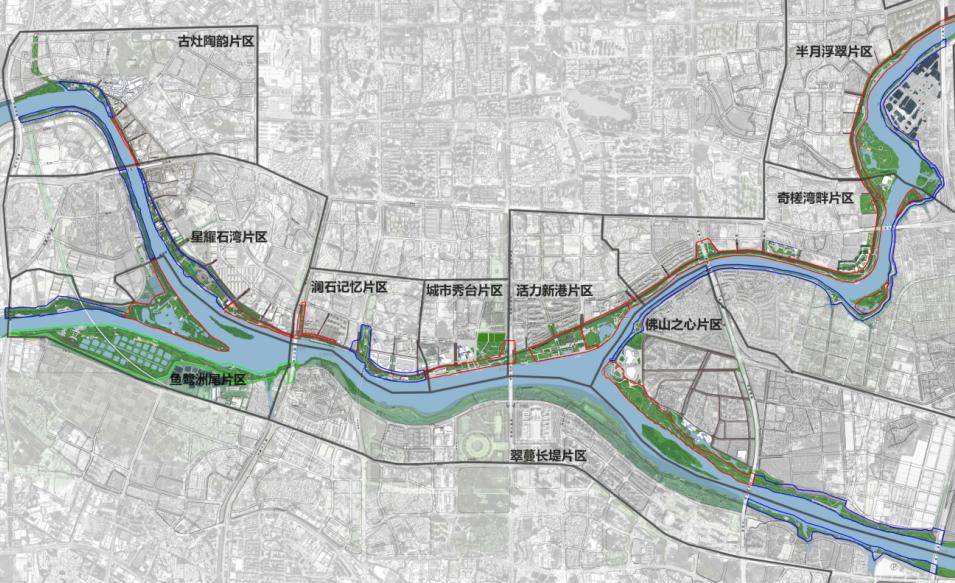 以佛山新城滨江景观带为基础,结合会展中心打造潭洲水道南岸城市地标,通过东西两端拓展,结合沿线功能地块建设,将南岸建设成为生态景观优美、公共服务完善的城市滨江休闲带。