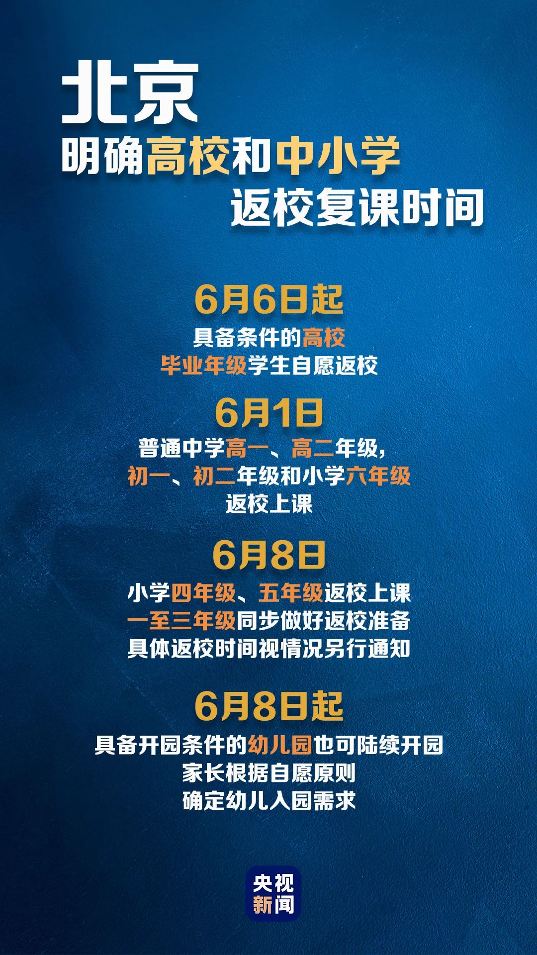 6月6日起,北京的高校具备校园疫情防控条件的,可安排毕业年级学生自愿返校,其他年级具体复课时间由学校结合工作实际自定。坚持未经批准不返校的原则。