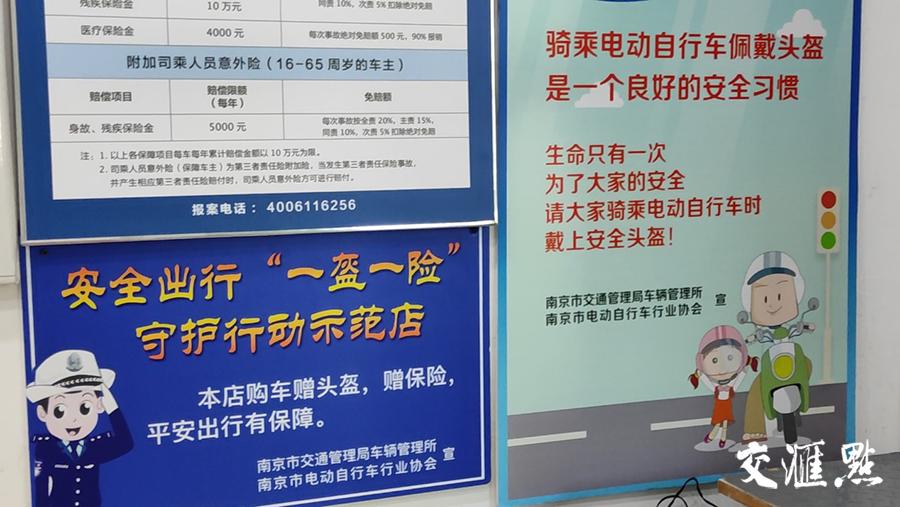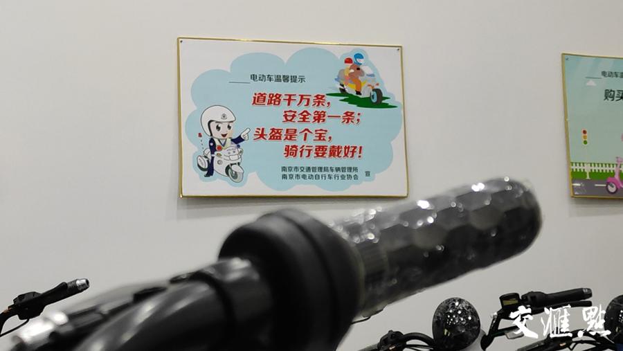 记者在走访南京的电动车经销点时发现,不少商家都在店内张挂起了“骑车戴头盔,平安把家归”一类的宣传标语,并将自家新上市的电动车头盔摆在了醒目位置。