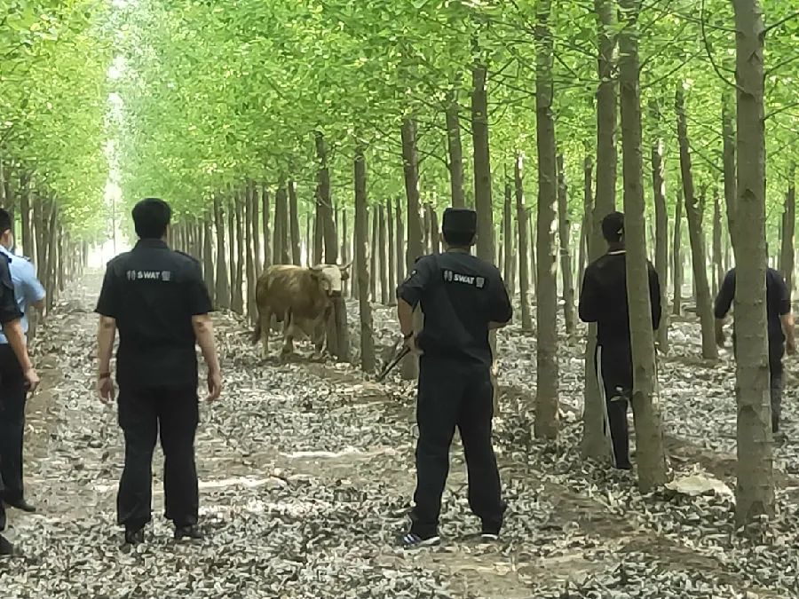 因处置现场系村外一处树林,无制高点、无圈存围栏,疯牛行动自由性强,且该疯牛体格极其健硕,一旦处置不当,极有可能激怒疯牛,局面失控,造成更大的攻击伤害。现场处置民警、特警、牛主人等共同商议,制定科学处置预案,合理分配警力部署。