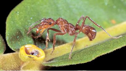除了自我防御,植物有时也会主动出击,甚至显露出某种“邪恶”的本质。在非洲和拉丁美洲,有一种金合欢属植物会分泌花外蜜,其中富含能量和糖分,能够吸引蚂蚁来此居住。而蜜露中不只含有糖分,还有数百种其他化学成分,包括很多种生物碱和非蛋白质氨基酸,能够控制蚂蚁的神经系统,调节神经应激性,进而操控它们的行为。由此,合欢属植物使蚂蚁成了自己的专属雇佣兵,随时向来犯的动物发起攻击。